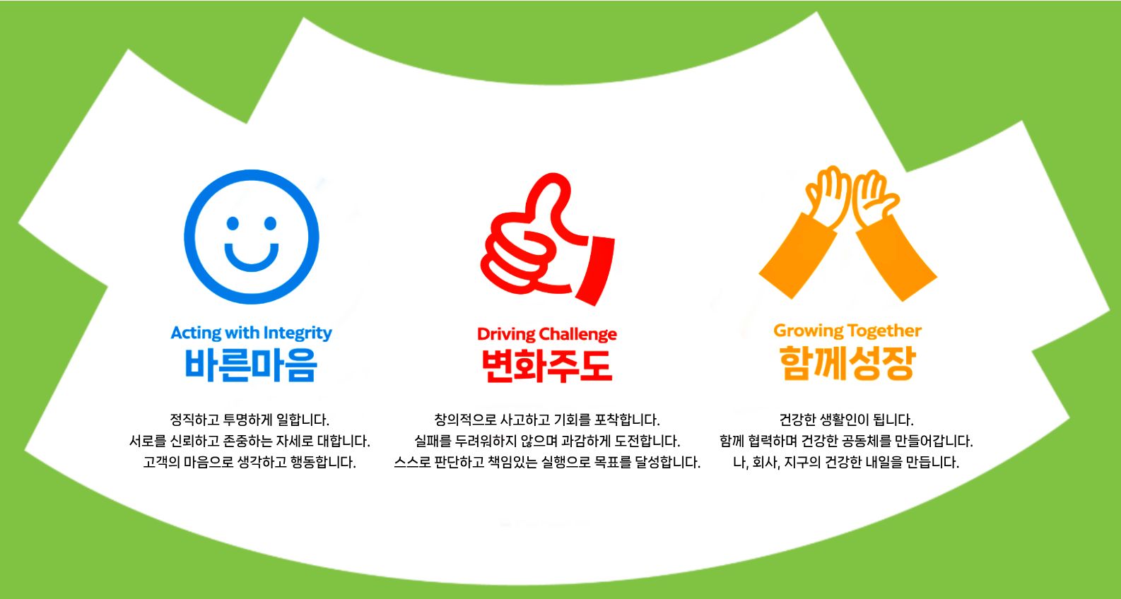 지속적인 성장을 통해 고객의 일상 속 즐겁고 건강한 경험 확대를 통한 행복한 문화공간을 제공하는 푸드 서비스 전문 기업으로 지구환경의 건강 및 지속가능성까지 생각하는 로하스 가치를 실천하는 기업이 되겠습니다.